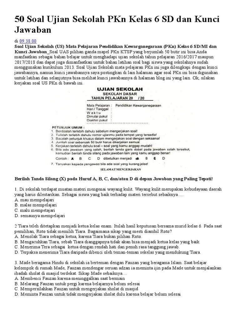 Kumpulan soal ukk semester 2 kelas 2 sd/mi pkn kelas 2. Top pdf us pkn soal ujian sekolah pkn elas 6 sd mi semester 2 akhir dikompilasi oleh 123dok.com. Soal ujian sekolah (us) mata pelajaran pendidikan kewarganegaraan (pkn) kelas 6 sd/mi dan kunci jawaban_soal uas pilihan ganda mapel pkn . Embed in my website or blog Soal ujian sekolah (us) pendidikan kewarganegaraan (pkn) kelas 6 sd/mi ini terdiri dari soal2 pertanyaan, soal isian dan soal pilihan ganda sebagai contoh .